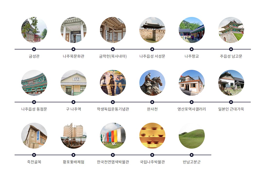 금성관 > 나주목문화관 > 금학헌(목사내아) > 나주읍성 서성문 > 나주향교 > 주읍성 남고문 > 나주읍성 동점문 > 구 나주역 > 학생독립운동기념관 > 완사천 > 영산포역사갤러리 > 일본인 근대가옥 > 죽전골목 > 황포돛배체험 > 한국천연염색박물관> 국립나주박물관 > 반남고분군